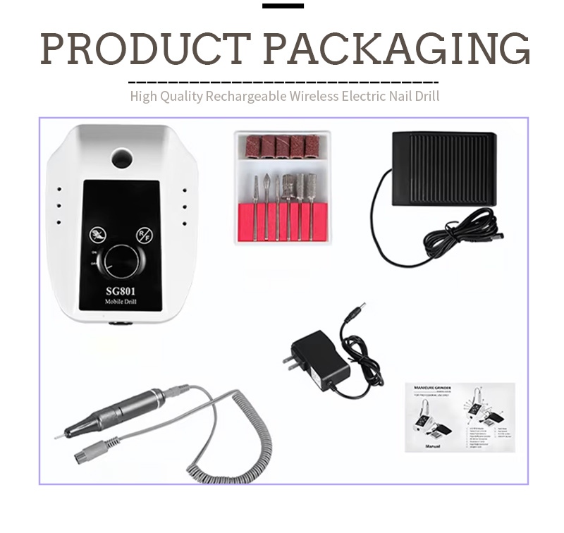 Бұл 35 000 айн/мин электрлі портативті гельдік тырнақ бұрғы пакетінің мазмұнында тегістеуіш қалам өнімі, USB зарядтау кабелі, өнімнің нұсқаулығы және жеңіл және портативті қорап бар.