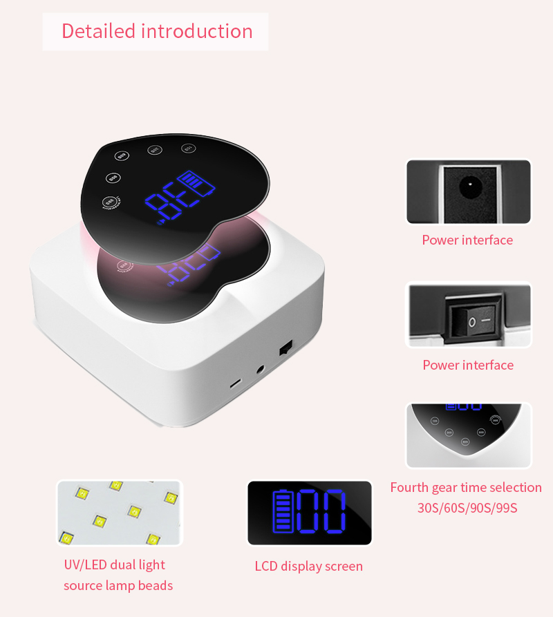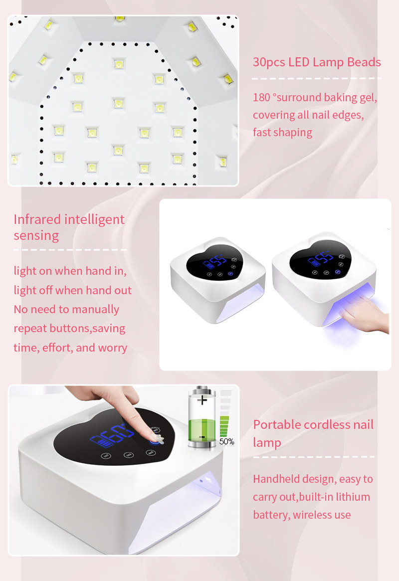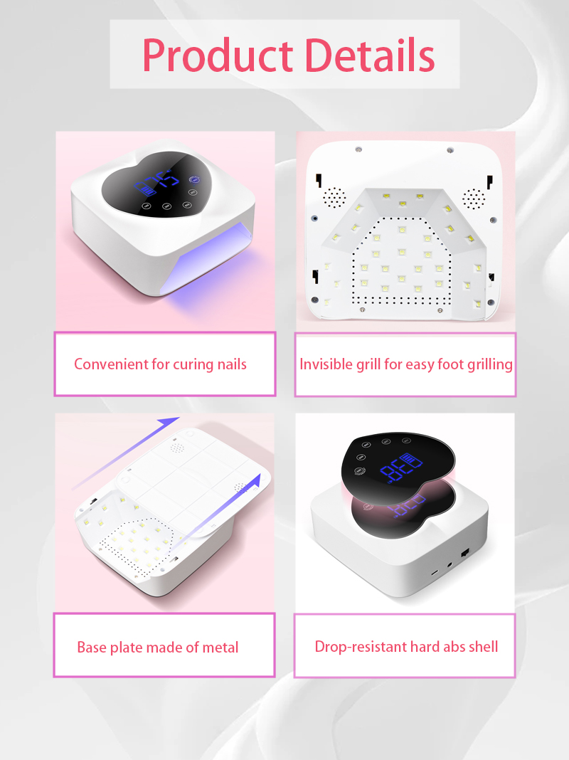 Өнім желімнің шөгуінсіз біркелкі кептірілуін қамтамасыз етеді. Оның қос жарық көздері қолдың түсінің өзгеруін және көздің шаршауын болдырмау үшін жұмсақ қыздыруды қамтамасыз етеді, екі қол мен аяққа жарамды, керемет жылдам кептіру нәтижелерін береді.