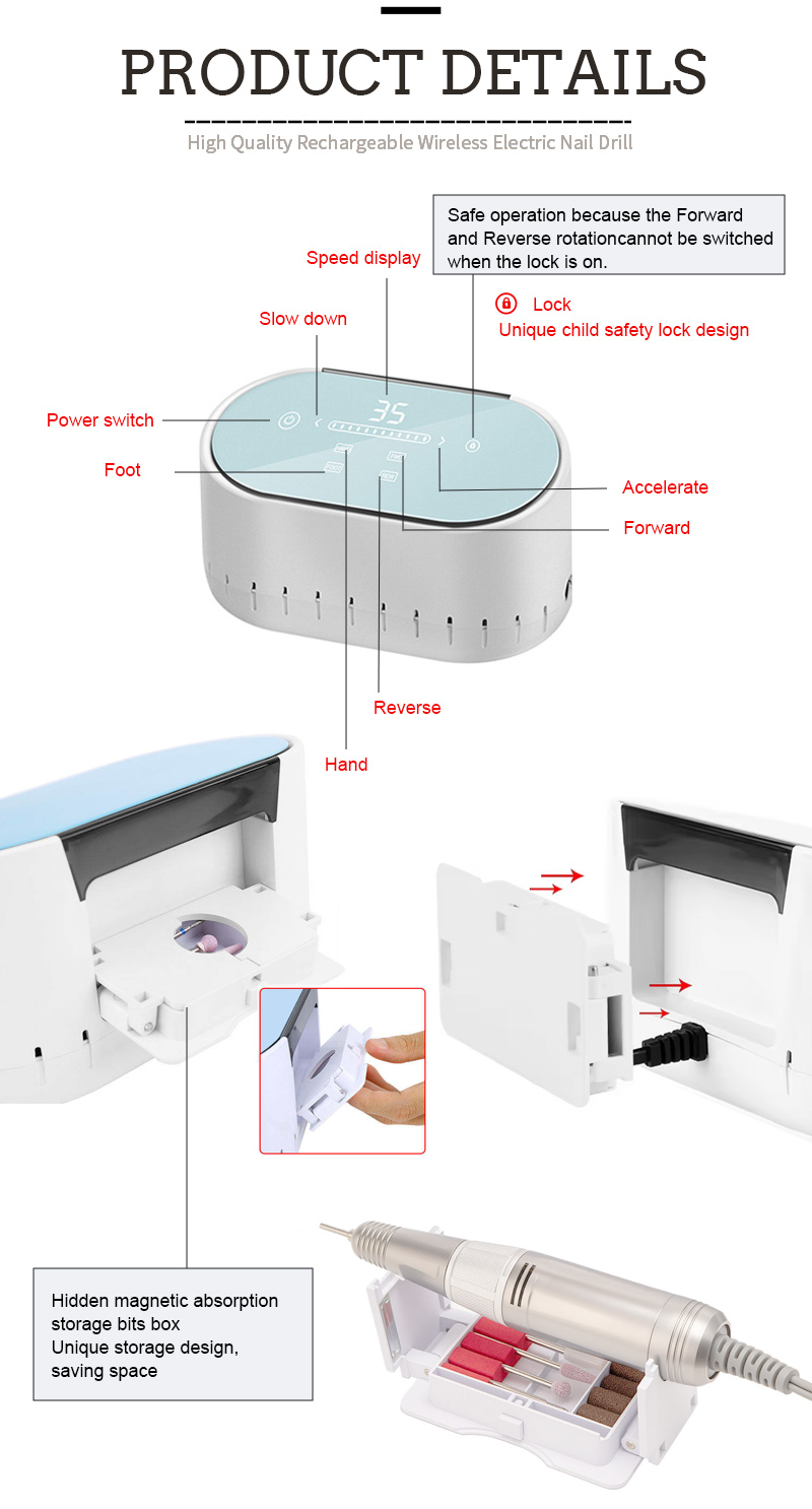 Қайта зарядталатын тырнақ бұрғы жинағы Саусақтардағы тырнақ бұрғылары 35w 35000rpm