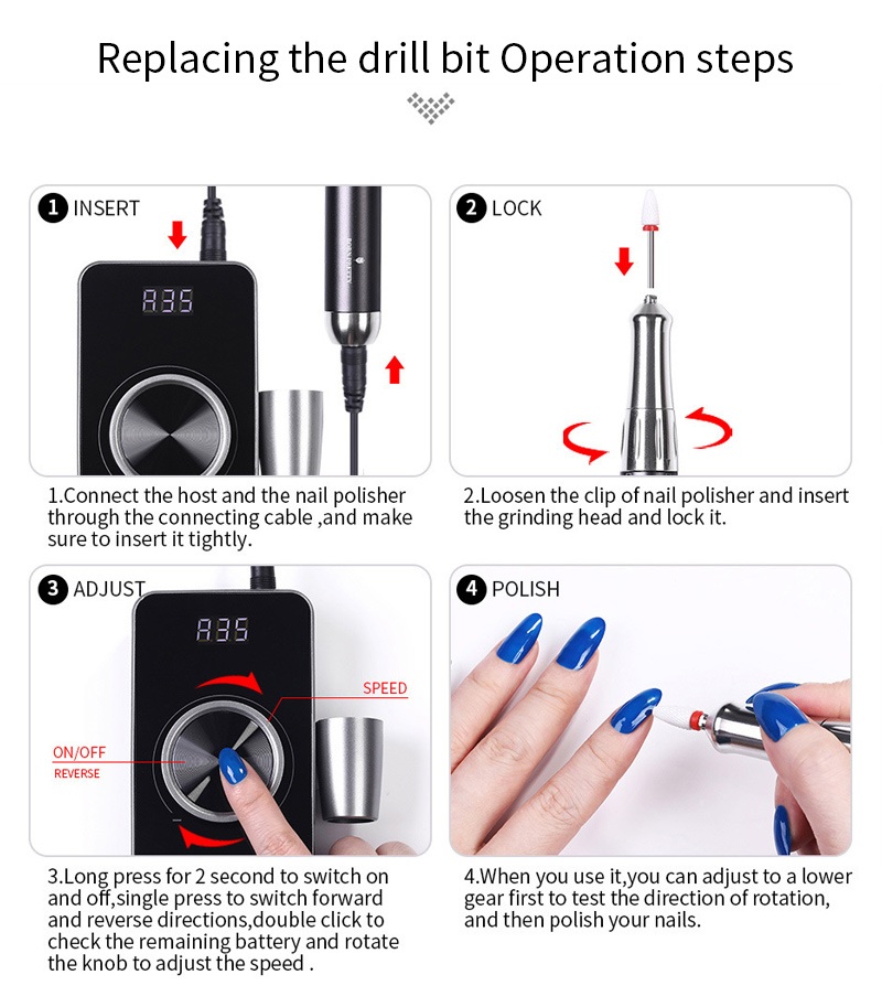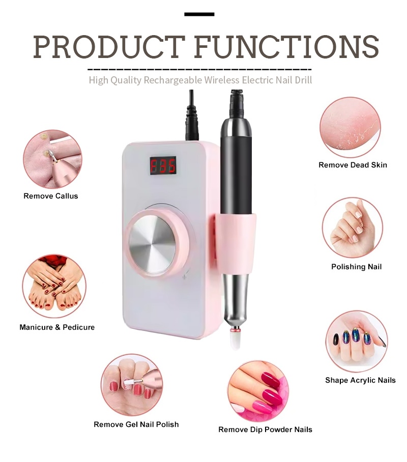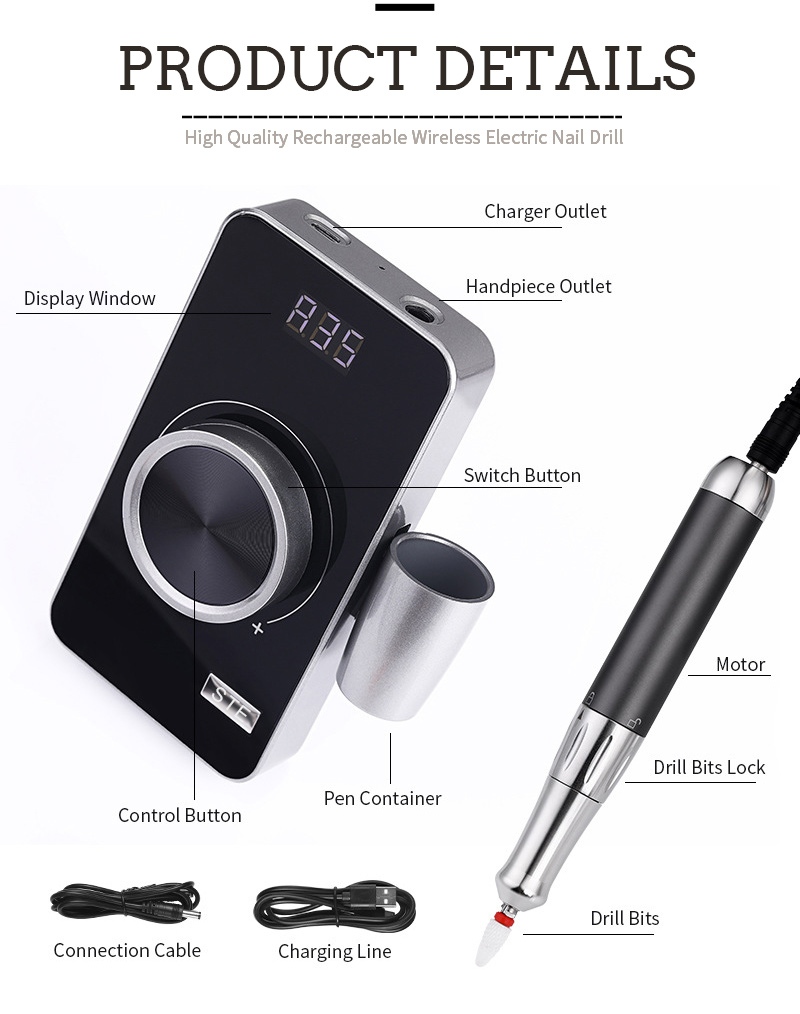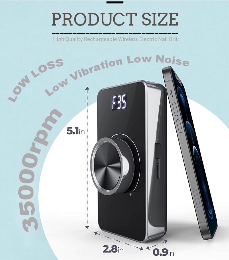Бұл қабыршақтайтын 35 000 айн/мин электр тырнақ бұрғышының дисплей дизайнында жалпы бір түймені іске қосу үшін қосу/өшіру қосқышы және алға/кері айналдыру, төменгі жағында жылдам зарядтау розеткасы, үстіңгі жағында ауыстырылатын бұрғы розеткасы және әртүрлі қажеттіліктерді қанағаттандыру үшін үш позицияда реттелетін жылдамдық бар.