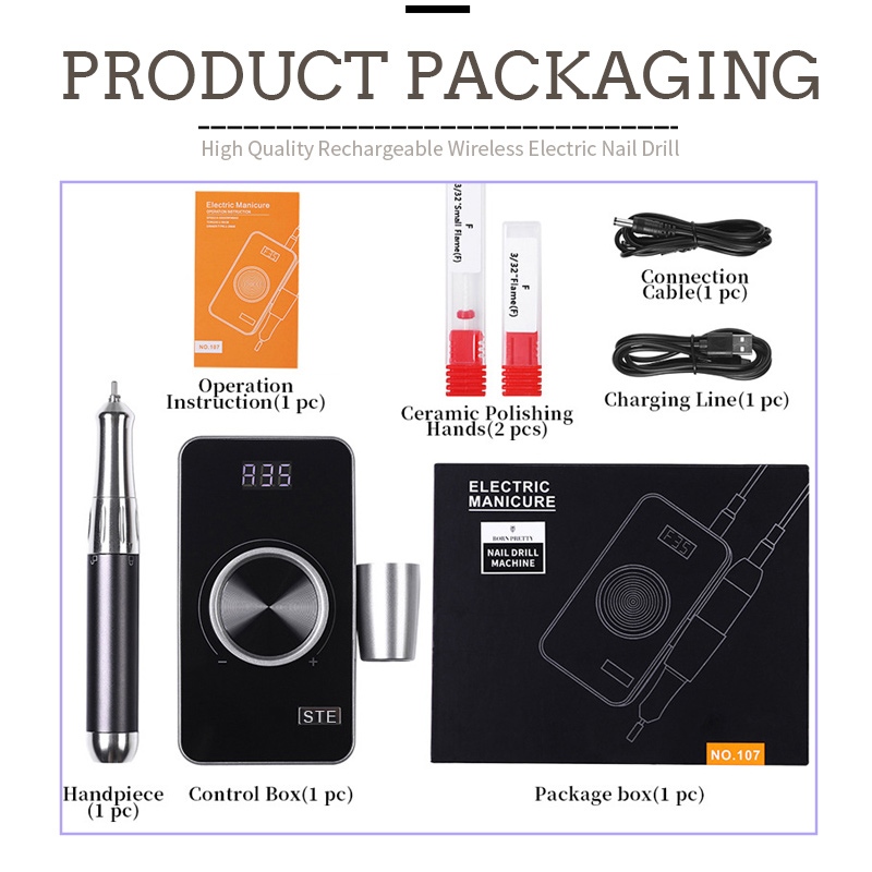 Бұл қабыршақтайтын 35 000 айн/мин электр тырнақ бұрғы пакетінің мазмұнында тегістеуіш қалам өнімі, USB зарядтау кабелі, өнімнің нұсқаулығы және жеңіл және портативті қорап бар.
