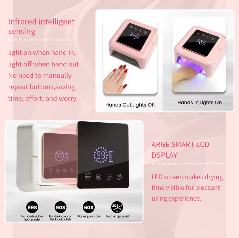 Бұл жоғары сапалы гельдік лак тез құрғататын шам желімнің біркелкі кебуін қамтамасыз етеді. Оның қос жарық көздері қолдың түсінің өзгеруін және көздің шаршауын болдырмау үшін жұмсақ қыздыруды қамтамасыз етеді, екі қол мен аяққа жарамды, керемет жылдам кептіру нәтижелерін береді.