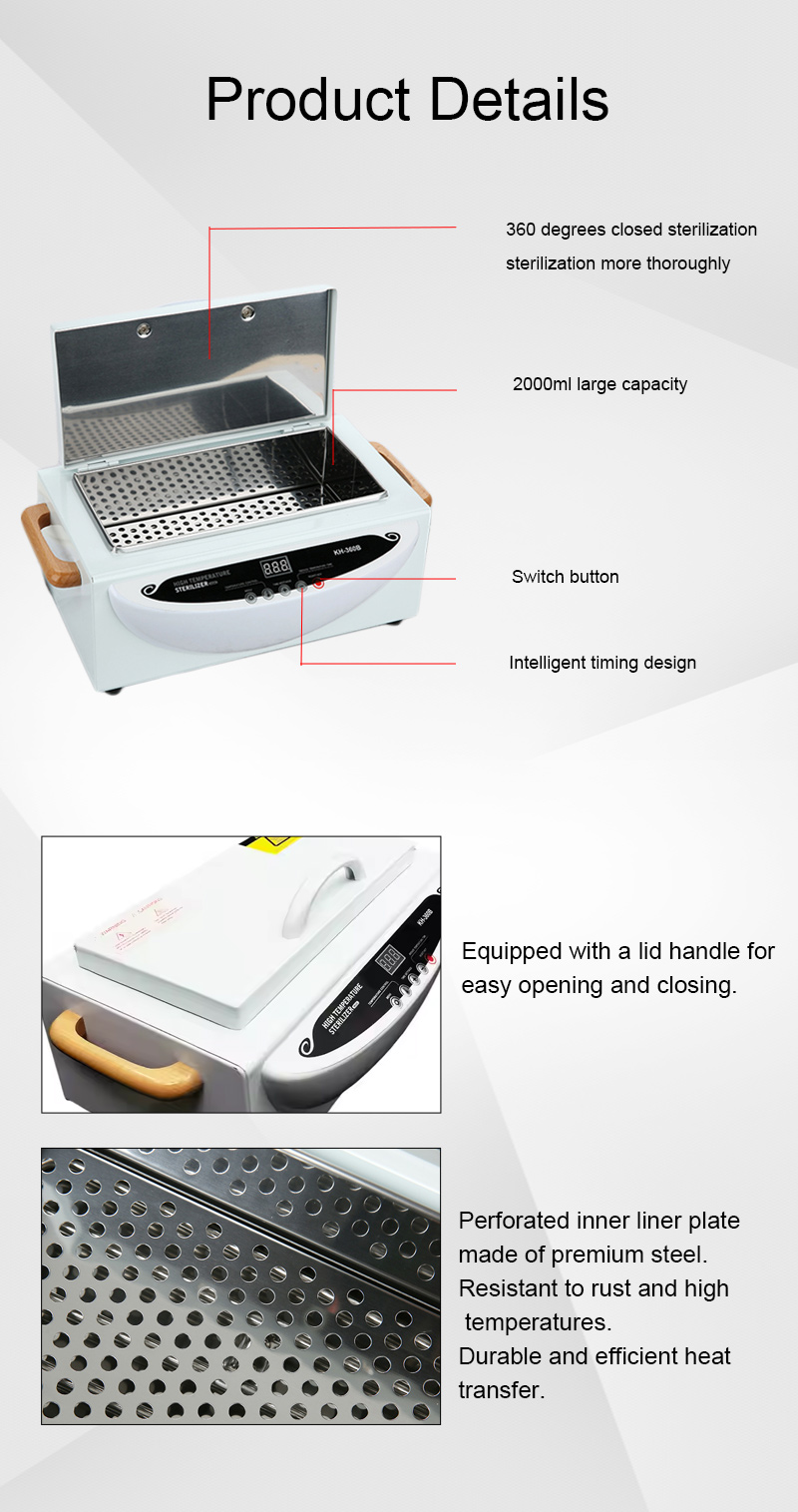 Бұл стерилизатор, ең алдымен, дезинфекцияға арналған жоғары температураны пайдаланатын жылыту сақинасы арқылы жылуды жасайды.