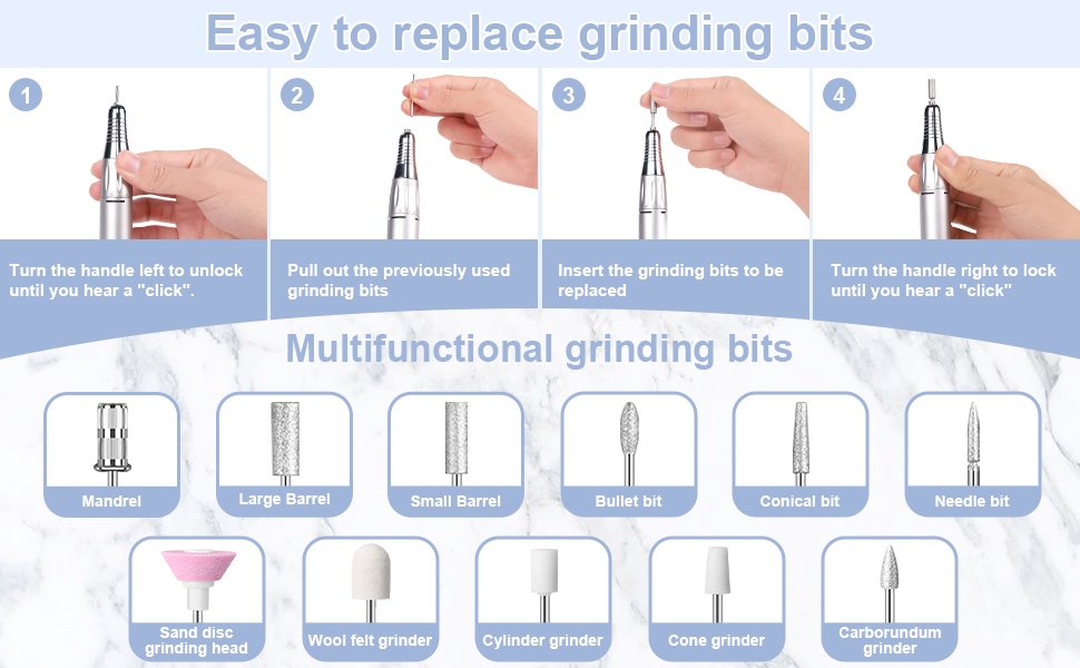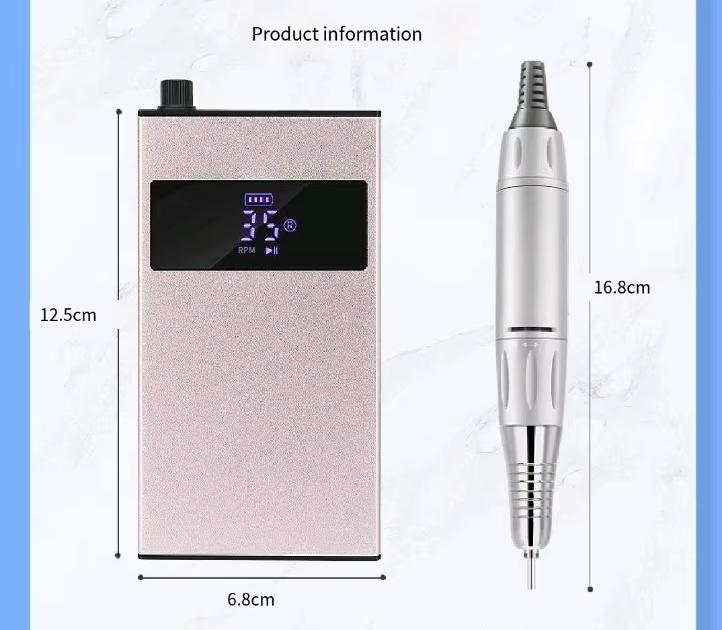 Бұл төмен шуы бар тырнақ бұрғы жинағының дисплей дизайнында қосу/өшіру қосқышы және жалпы бір түймені іске қосу үшін алға/кері айналдыру, төменгі жағында жылдам зарядтау розеткасы, үстіңгі жағында ауыстырылатын бұрғылау ұясы және әртүрлі қажеттіліктерді қанағаттандыру үшін үш позициялық реттелетін жылдамдық бар.