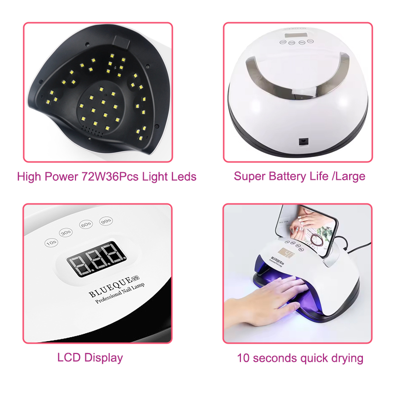 Өнім желімнің шөгуінсіз біркелкі кептірілуін қамтамасыз етеді. Оның қос жарық көздері қолдың түсінің өзгеруін және көздің шаршауын болдырмау үшін жұмсақ қыздыруды қамтамасыз етеді, екі қол мен аяққа жарамды, керемет жылдам кептіру нәтижелерін береді.