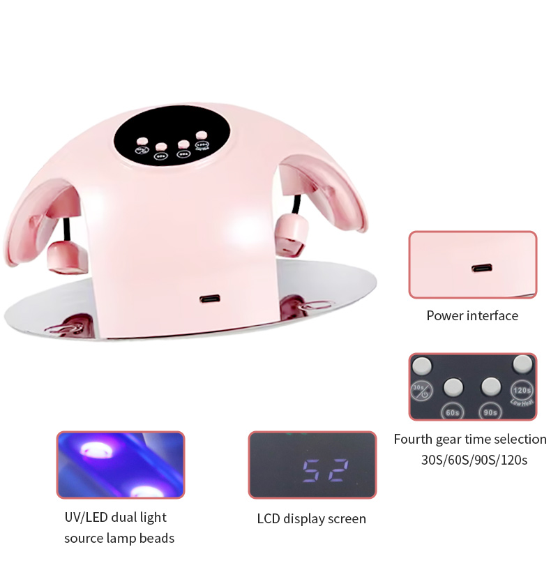 Өнім тіпті желім кептіруді және қысқартусыз қамтамасыз етеді. Оның қос жарық көздері жұмсақ қыздыруды қамтамасыз етеді, бұл қол түссіздендіруді және көздің түкпіржолін, қолдан да, аяққа да, аяққа да, аяққа да, кебу нәтижесін береді.