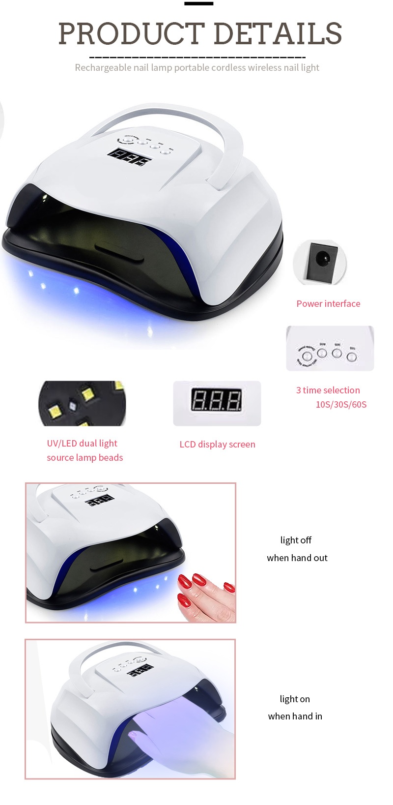 Тырнақты кептіруге арналған портативті шамның инфрақызыл смарт сенсорлық технологиясы бар, ол қолдар жақындағанда автоматты түрде жанады және қолдар алыстаған кезде өшеді, бұл түймелерді қайта-қайта басу қиындықтарын болдырмайды және уақыт пен күш-жігерді үнемдейді. Қуатты пісіруге арналған желім ұзақ күтуді қажет етпейді, бұл уақыт пен күш-жігерді үнемдейді.