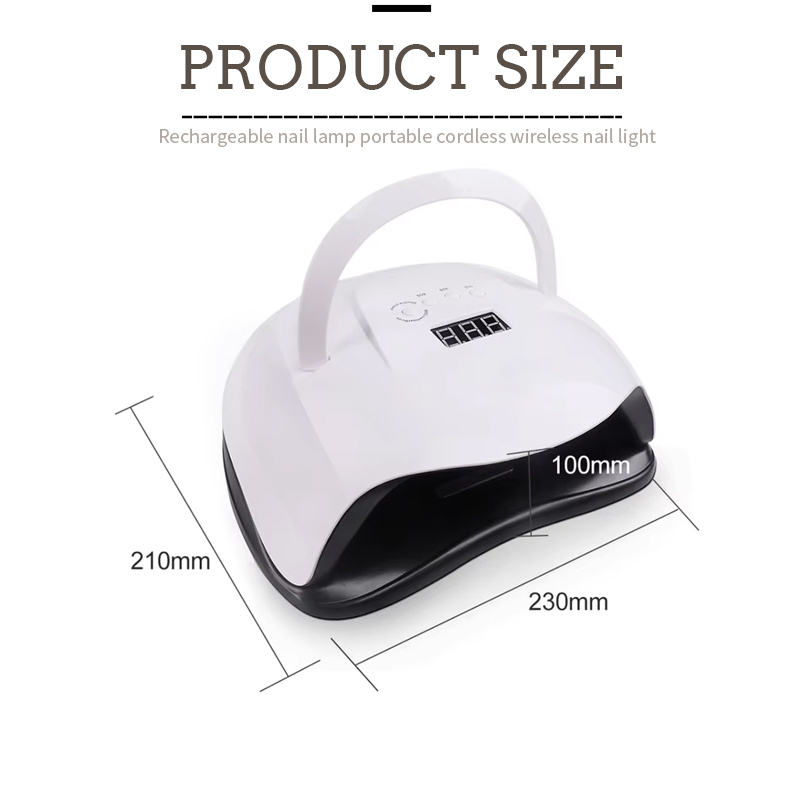 Тырнақты кептіруге арналған портативті шамның өлшемдері ұзындығы 180 мм, ені 190 мм және биіктігі 85 мм, үлкен сыйымдылығы бар және екі қолды да, аяқты да пайдалану мүмкіндігі бар, бұл өте ыңғайлы.