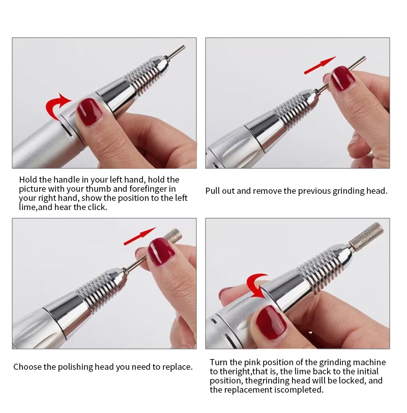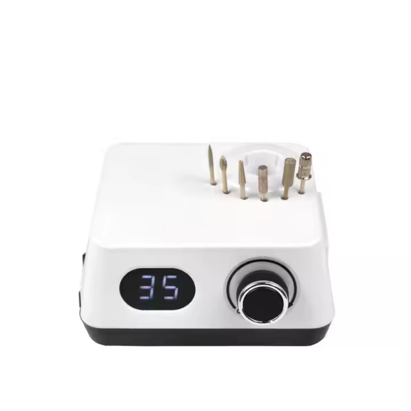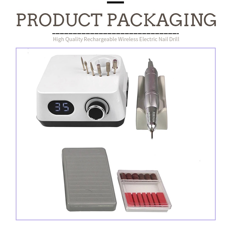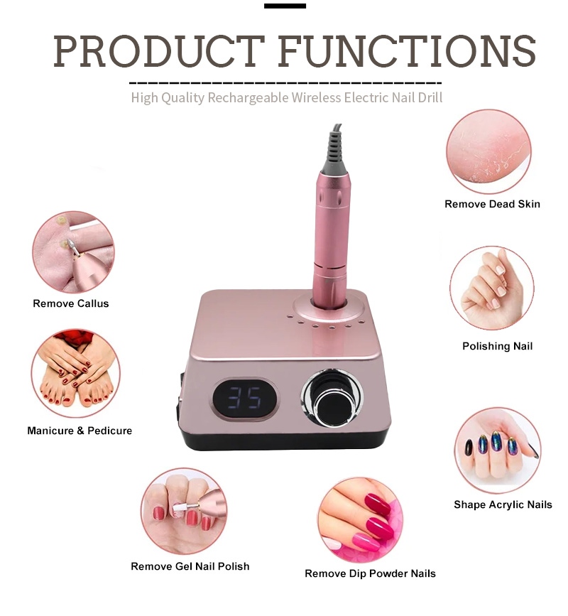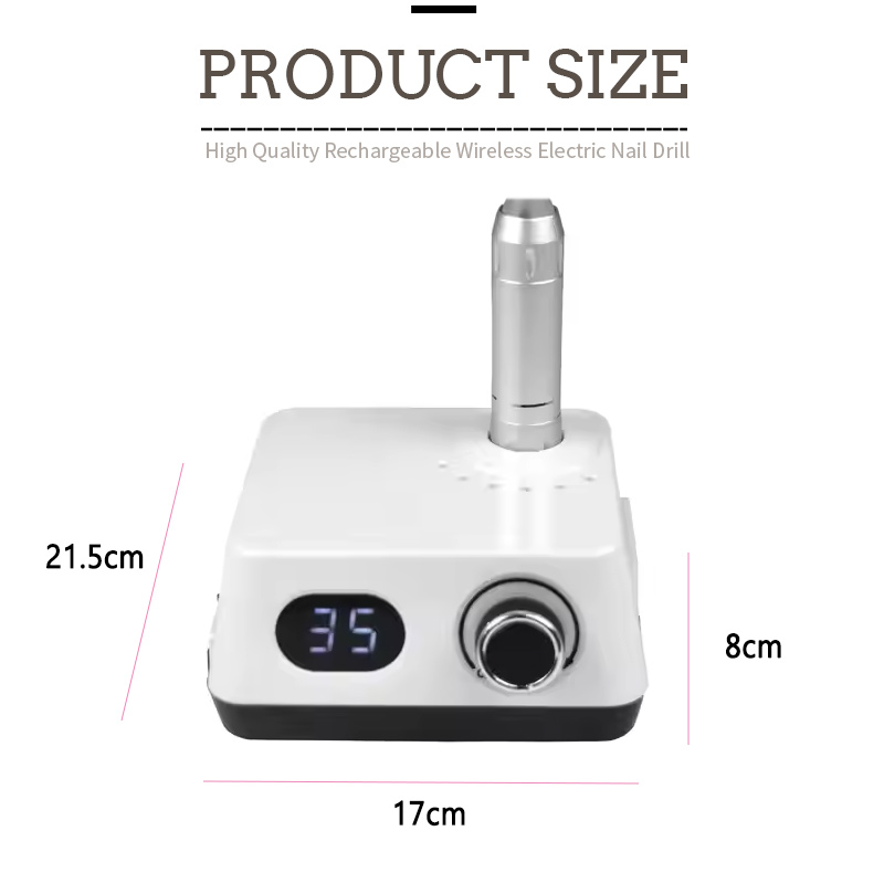 Жылдамдығы 35 000 айн/мин болатын осы сымсыз электрлі тырнақ бұрғышының дисплей дизайны жалпы бір түймені іске қосу үшін қосу/өшіру қосқышы және алға/кері айналдыруға, төменгі жағында жылдам зарядтау розеткасына, жоғарғы жағында ауыстырылатын бұрғы розеткасына және әртүрлі қажеттіліктерді қанағаттандыру үшін үш позицияда реттелетін жылдамдыққа ие.
